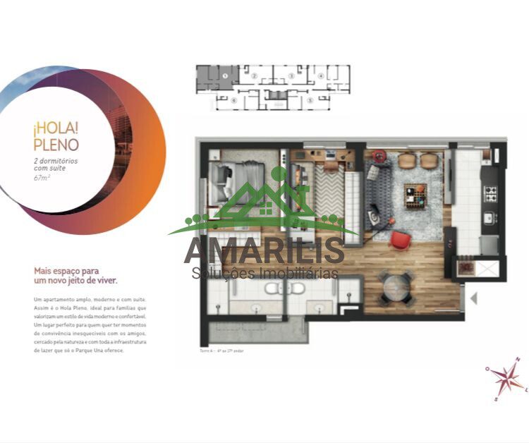 apto novo no Hola, nunca habitado, 9° andar, 67m de área construida, sala de estar, cozinha planejada, 2 dormitórios sendo 1 suíte, banheiro social, área de serviço, vaga de garagem, infra estrutura do condomínio completa com elevador, salão de festas, espaço gourmet, quadras poliesportivas, piscina, playground, quiosque com churrasqueira, bicicletaria, salão de jogos, academia, aceita financiamento, chaves conosco.